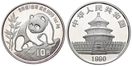 CHINA. 10 Yuan. (Ar. 31,10g/40mm). 1990. Serie Panda. (Km#276). PROOF.