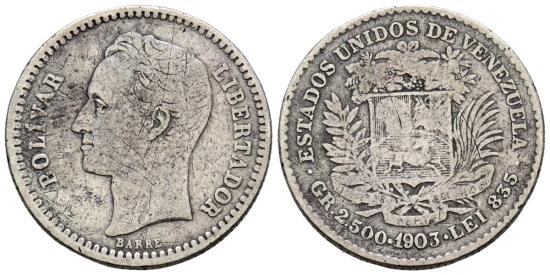 VENEZUELA. 50 Céntimos. (Ar. 2,50g/18mm). 1903. Philadelphia. (Km#21). MBC-.