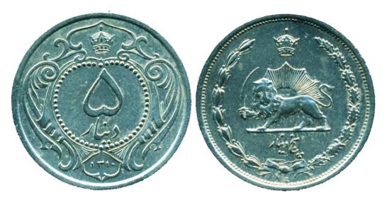 IRAN, PAHLAVI: REZA SHAH (1304-1320 SH/1925-1941), Copper-Nickel 5 Dinar ( 18.5 mm), Struck SH 1310 (1931), It is KM#1125  EF+! A BEAUTY! RARE!
