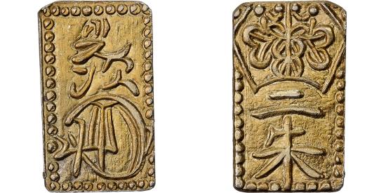 | | Japan, Kōmei, 2 Shu, Man'en, 1860-1869, Edo, Electrum, | | | 2 Shu "Man'en Nishukin"; Tokugawa Shogunate - Kōmei Tennō (1846-1867); KM C 18a, JNDA 09-44, DHJ 8.51., Electrum coin, with a gold fineness of around 229‰. | | FEATURES |