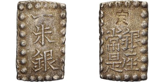 | | Japan, Kōmei, 1 Shu, Kaei, 1853-1865, Edo, Silver, | | | 1 Shu "Kaei Isshugin"; Tokugawa Shogunate - Kōmei Tennō (1846-1867); KM C 12, JNDA 09-53, DHJ 9.85-9.86., Identical to the 1 Shu ‘Ansei’ coins. | | FEATURES |