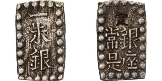 | | Japan, Kōmei, 1 Shu, Kaei, 1853-1865, Edo, Silver, | | | 1 Shu "Kaei Isshugin"; Tokugawa Shogunate - Kōmei Tennō (1846-1867); KM C 12, JNDA 09-53, DHJ 9.85-9.86., Identical to the 1 Shu ‘Ansei’ coins. | | FEATURES |