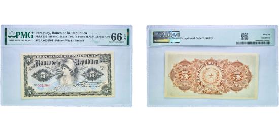 Paraguay Republic 1907 5 Pesos (Moneda Nacional - 1/2 Peso Oro) Paper Gem Uncirculated EPQ 66 P 156 Pratt MC160