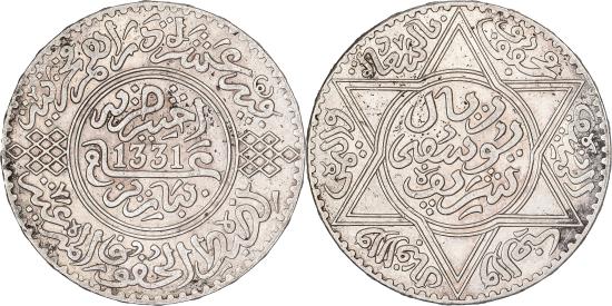 | | Morocco, Yusuf, Rial, 10 Dirhams, AH 1331/1913, bi-Bariz, Silver, | | | Inscription and date within the Star of David, legend flanked by star points, Mint name and date within circle, المُنِيڢٗ | محڢُوڢ | بالسَعٚادة | واليمںٗ | والاڧبال | والعِز