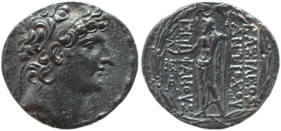 Antiochus VIII - toned Minted: Antioch on the Orontes Size: 29mm Weight: 15.33 grams Obverse: Diademed head right, fillet border Reverse ΒΑΣΙΛΕΩΣ ΑΝΤΙΟΧΟΥ ΕΠΙΦΑΝΟΥΣ, Zeus, crescent above head, standing left, star in extended right and long scepter vertical in left, IE / A in left field, N inner right, laurel wreath border