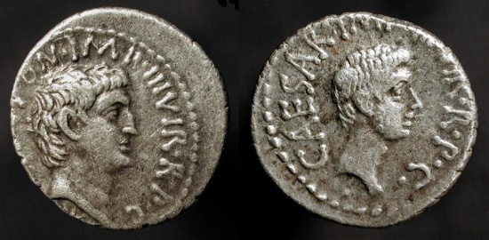 Marc Antony and Octavian 40-39 BC Silver Denarius (3.48 gm) Military Mint traveling with Marc Antony Obv : [M • AN]TON • IMP • III • VIR • R • P • C ; Bare head of Antony right; star below. Rev : CAESAR • IM[P • III • V]IR • R • P • C • ; Bare head of Octavian right, wearing slight beard; pellet below. RSC 1; Sydenham 1193 On consignment from a long time collector |