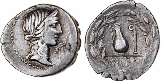 | | Caecilia, Denarius, 81 BC, North Italy, Countermark, Silver, | | | Q. Caecilius Metellus Pius. Crawford:374/2. Countermark "N" on observe., Head of Pietas, right, wearing diadem; before, stork., Jug and lituus. Laurel wreath around., Q. Caecilius Metellus Pius. Crawford:374/2. Countermark "N" on observe., IMPER | | FEATURES |