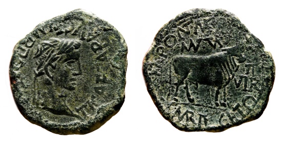 Obverse: TI CAESAR AVG F IMP PONT M. Laureate head right. Reverse: M PONT MARS/MVN TVR above, C MARI VEGETO below, II/VIR to right, bull standing right. Very good exemplar of this interesting and scarce coin, in VF+ condition, conserving complete details in both sides, which is difficult to find in this issue. Specially well preserved bust of Tiberius. Nice green patina totally natural. Better in hand (really, it´s not a topic). RPC 418. 16,0 g - 29 mm |