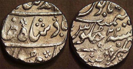 The Mughal style coinage was commenced in Bombay in 1717. The five-petalled flower with stem became the mintmark for Bombay in 1735. This coin is a VERY SCARCE type, unlisted in Pridmore, and in CHOICE condition. | |