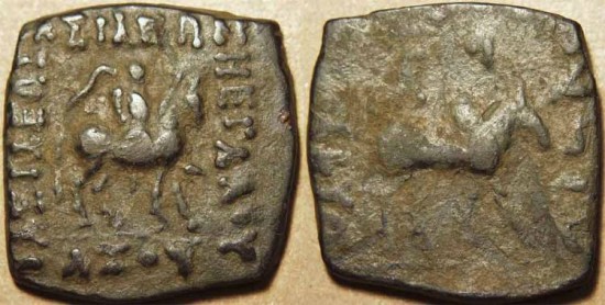 Obverse King mounted on horse right, holding spear, Greek legend around: BAΣIΛEΩΣ BAΣIΛEΩN MEΓAΛOY / AZOY