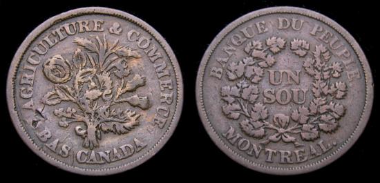 Tokens of Lower Canada 1837 Banque du People Montreal Un Sou Agriculture & Commerce Bas Canada Belleville Issue LC-5A1 BR-715 VF. Open Wreath, large bow, reeded.