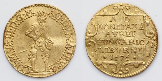 Coins of Italian mints Livorno Cosimo III de'Medici, 1670-1720. Ongaro 1676, AV 3.46 g. COSMVS III D G MAG DVX ETRV VI The Grand Duke, radiated and in armor, standing in D., holds in his hand d. the scepter and rests the s. on the hilt of the sword. Rv. AD / BONITATE / AVREI / HVNGARIC / LIBVRNI / 1676 within an ornate folder. CNI 10. Galeotti XXXV / 9. Friedberg 464. Very rare. |