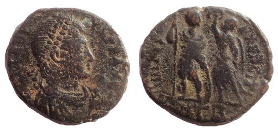 Arcadius AE3. 395-401 AD. 16 mm. 2.8 gm. Obv: D N ARCADI-VS P F AVG, pearl-diademed, draped and cuirassed bust right. Rev: VIRTVS EXERCITI, emperor holding spear and shield on ground, standing right, crowned by Victory advancing left, ANT in exergue.