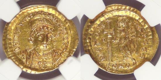 | BYZANTINE EMPIRE, Justinian I (527-565 AD), circa 527-37 AD, Gold Solidus, graded Choice AU by NGC |