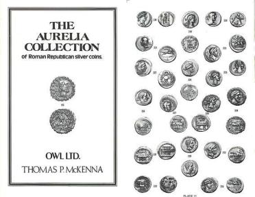 Owl Ltd.(John Barton) - The Aurelia Collection of Roman Republican Silver Coins (joint list with Thomas P. McKenna, October 1980). Small-format fixed-price catalogue with 300 Roman Republican coins, almost all photographed. High quality photographs. A very nice private collection, 32 pages, 15 plates, NEW copy offered at reduced price.