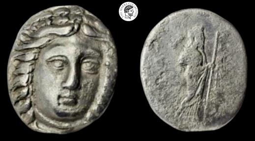obv: Three-quarter facing  right head of Apollo wearing laurel wreath.