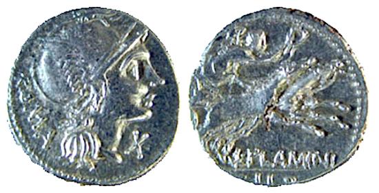 | TCRRS-3486, L. Flaminius Chilo, AR 109-108 BC, Rome mint, (3.960 grams), obv. helmeted head of Roma to right, ROMA behind, X below chin, rev. Victory in biga, L.FLAMINI below, and CILO in exergue, (S.170, Cr.302/1, Syd.540). About as struck, AU |