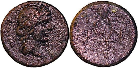 TCGKB-54, MYSIA, KYZIKOS AE 2.72 gm 15 mm, 1st and 2nd century AD. Obv: Head of APOLLO right without a beard. Rev: KY/ZI above lyre. BMC-173-4 (pl 13 p4), SNG COP 85 (pl 3) Nice VF, dark patina.