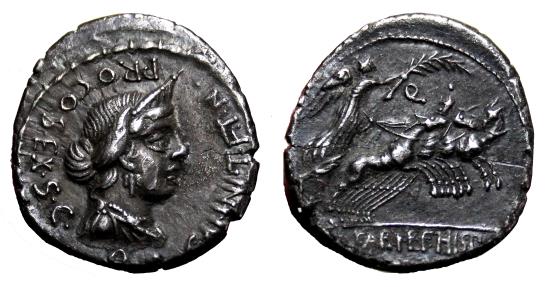 Obverse: C ANNI T F T N PRO COS EX S C. Draped bust of Anna Perenna right, wearing stephane; winged caduceus to left, Q dot below. Reverse: L FABI L F HISP. Victory driving quadriga right, holding palm frond and reins, Q dot above horses. Very good exemplar of this interesting issue, in EF-/EF condition, conserving full details on both sides and very bold reliefs checkable at photo. Toned silver. Crawford 366/2a. Mint in northern Italy or Spain, 82-81 BC. 3,7 g - 19,5 mm -------------------------------------------------------------------------------------------------- Visit our site about Numismatics and Archaeology: aeternitas-numismatics.com |