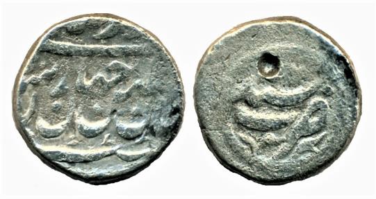 PERSIA, INDIA, Nadir shah (1148-1160 AH/1735-1747 AD) founder of Afsharid dynasty. Silver Rupi (11.01 g 18 mm dia. 4 mm thick) a thick coin, Mint of Sind ( in India), No date type . one testmark on reverse side. RARE Mint, It is Album-2744.1 avf Obverse: Nader shah's royal couplet. هست سلطان سلاطین جهان شاه شاهان نادر صاحبقران Reverse: Sharp Mint in a circle. ضرب سند |