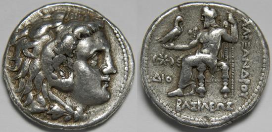 Head of Herakles to right, wearing lion skin headdress / Zeus Aëtophoros seated to left, holding sceptre; ΒΑΣΙΛΕΩΣ below, ΑΛΕΞΑΝΔΡΟY to right; star between two crescents above ΔIO in left field.