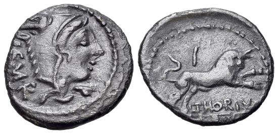 ROME REPUBLIC L. Thorius Balbus, Rome, c. 105 BC. AR Denarius R/ BULL
