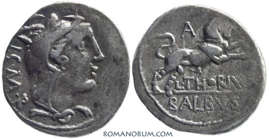 Bull charging right, A above, L•THORIVS below, BALBVS in exergue.