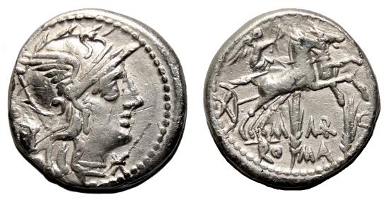 Reverse: Victory in biga right, M. MARC ROMA in two lines below horses, divided by two ears of corn.