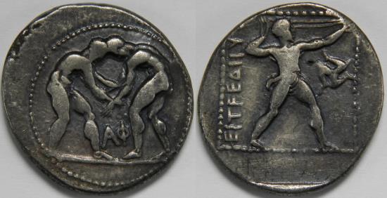 Pamphylia Aspendos AR Stater circa 380/375-330/325 BC Two wrestlers grappling, AΦ between / Slinger in throwing stance right; to right, triskeles to left. 10.82 grams, 23 mm. Very Fine. Dark patina. Light scratches. Tekin Series 4, SNG France 83, BMC 31, SNG von Aulock 4566, SNG Copenhagen 228. Purchased from Savoca Numismatik, München. |