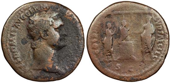 AE As 10.42g. 29mm. 88 A.D. Rome Mint Laureate head, r. IMP CAES DOMIT AVG GERM PM TR P VIII CENS PER P P Domitian standing l., sacrificing over altar; to l., lyre and flute players standing r.; temple in background with five columns; In ex.: SC COS XIIII LVD SAEC FEC RIC II.1 623 Reddish brown patina. Porous. Large stain on obverse. Ludi Saeculares (Secular Games) issue.