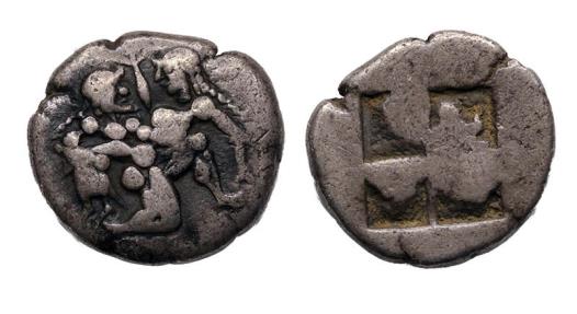 ISLANDS off THRACE, Thasos. Circa 50 BC. AR 0-480Third Stater – Drachm (16mm, 3.93 g). Satyr advancing right, carrying off protesting nymph / Quadripartite incuse square. Le Rider, Thasiennes 3; HGC 6, 332. Condition: VF. Well centered and fine cabinet toning. |