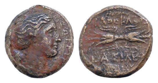 | SICILY, Syracuse. Agathokles. 317-289 BC. Æ Trias (22mm, 9,5g,). Struck circa 304-289 BC. Draped bust of Artemis Soteira right, quiver over shoulder / Winged thunderbolt |