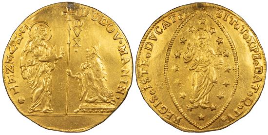 AV 10 Zecchini 49mm. 34.15g. St. Mark standing, presenting gospels to Doge, kneeling and supporting staff topped with cross. Christ in glory, 16 stars within the mandorla. KM 761; Fr. 1439; CNI VIII #62 Some lustre and toning in protected areas. Ex-jewelry with repair at top, as is typical. Lodovico Manin (1725-1802) was the last Doge of Venice. Click here to follow our store and receive e-mail notifications when new items are added. |