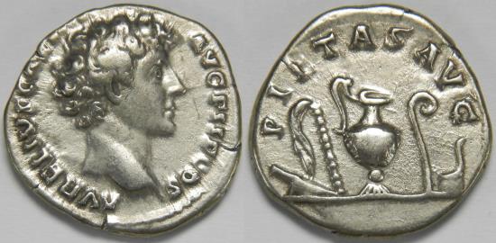 Roman Empire Marcus Aurelius as Caesar AR Denarius (Rome, AD 140-144) Bare head right / Emblems of the pontificate: secespita, aspergillum, guttus, lituus and simpulum. 3.29 grams, 17 mm. Good Very Fine. RIC 424a (Antoninus Pius), RSC 451. Purchased from Rex Numismatics, Rotterdam. |