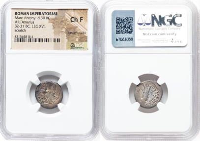| Marc Antony, as Imperator and Triumvir (43-30 BC). AR denarius (17mm, 10h). NGC |