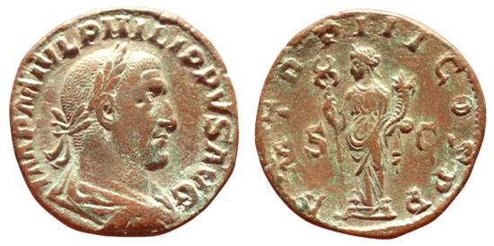 Philip I (244-249), AE Sestertius,Rome, AD 246-247, IMP M IVL PHILIPPVS AVG, laureate, draped and cuirassed bust r., Rv. P M TR P III COS P (sic!), Felicitas standing l., holding caduceus and cornucopiae; in field, S - C. RIC 149; C 125. (g 17,21, mm 30,). |