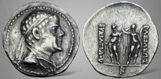 Baktria, Greco-Baktrian Kingdom. Eukratides I. (Circa 170-145 BC). AR Hemidrachm. 1.60gm, 16.3mm, Uncertain mint in Paropamisadae. Diademed and draped bust right within pelleted border / EYKIΛIIΔOY on the left, IΛΣIΛEΩΣ on the right, the Dioskouroi, nude, standing facing, each holding spear in