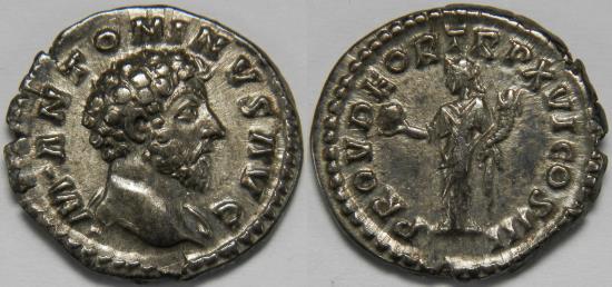 Roman Empire Marcus Aurelius AR Denarius (Rome, AD 162) Bare head right, slight drapery / Providentia standing left, holding globe and cornucopia. 3.49 grams, 19 mm. About Extremely Fine. Nice patina. RIC 48 var. (slight drapery), RSC 517. Purchased from Savoca Numismatik, München. |