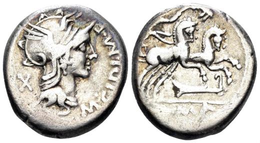 M. Cipius. 115-114 BC. AR Denarius (3.88g, 16mm). Rome mint. Obv.: helmeted head of Roma right; M•CIPI•M•F before, X behind. Rev.: Victory driving galloping biga right, holding reins and palm branch; rudder below; ROMA in exergue. Crawford 289/1; RSC Cipia 1. Toned VF.