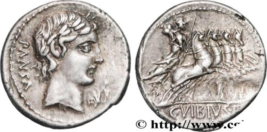 Reverse : C. VIBIVS. C. F. à lexergue Minerve debout dans un quadrige galopant à droite, casquée, tenant de la main droite un trophée et une longue javeline et les rênes de la main gauche