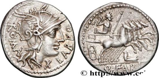 Obverse : ROMA/ LABEO Tête casquée de Rome à droite ; sous le menton, marque de valeur, X