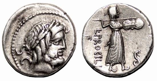 Reverse: L PROCILI F. Juno Sospita advancing right, hurling spear and holding shield decorated with thunderbolt; serpent to right.