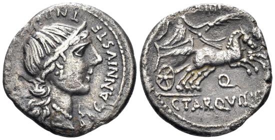 C. Annius T. f. T. n. and C. Tarquitius P. f. 82-81 BC. AR Denarius (3.65g, 18mm). Rome mint. Obv.: C•ANNIVS•T•F•T•N[•PRO•COS•EX•S•C•], diademed head of Anna Perenna right; scales beneath chin. Rev.: Victory in biga right; XIII above, Q below, C•TARQVITI•P[•F] in exergue. Crawford 366/4; RSC Annia 1. Toned VF.
