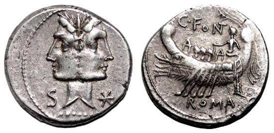 Mn. Fonteius AR Denarius. EF-. Dioscuri - Galley.