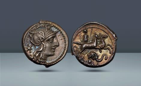 Roman Republic, Italy. L. Caecilius Metellus Diadematus, Rome, c. 128 BC, AR Denarius, 3.92g (19mm, 10h). Helmeted head of Roma to r, * behind / ROMA in exergue, Pax in biga to r., elephant's head with bell attached below horses, Pedigree: Ex Peus Auction 417, 2016, Lot 15. From the Dr. M. Sch. and Lückger Collections References: Craw 262, 1. Syd 496 Grade: Lovely sharp strike with iridescent toning. Minor marks otherwise beautiful Price: $1,950 rr1352