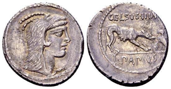 Rev: CELSUS•III•VIR; she-wolf standing to the right, placing stick on fire; on the right, eagle standing to the left, fanning the flames; in exergue: L•PAPIUS.