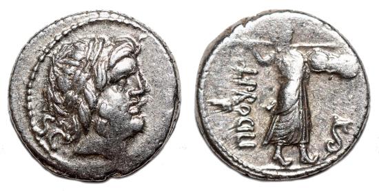 Reverse: L PROCILI F. Juno Sospita advancing right, hurling spear and holding shield decorated with thunderbolt; serpent to right.