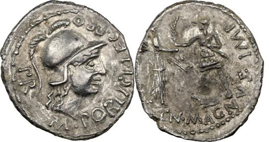 The Pompeians. Cnaeus Pompey Jr. Summer 46-Spring 45 BC. AR Denarius R/ HISPANIA and Pompeian soldier