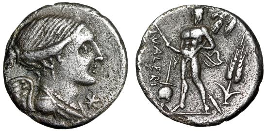 L Valerius Flaccus AR Denarius "Winged Victory / Mars, Apex & Grain" Very Fine