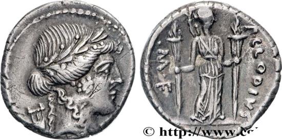 CLAUDIA Denier 42 AC. Rome silver Obverse : Anépigraphe Tête laurée dApollon à droite ; derrière la tête, une petite lyre Reverse : P. CLODIVS// M. F. Diana Lucifera drapée, avec son arc et son carquois, debout de face, tournée à droite, tenant dans chaque main un grand flambeau allumé Pedigree : Exemplaire provenant de la collection P. L Commentary : Flan court, centré. Très beau portrait d’Apollon. Revers bien venu à la frappe. Patine grise